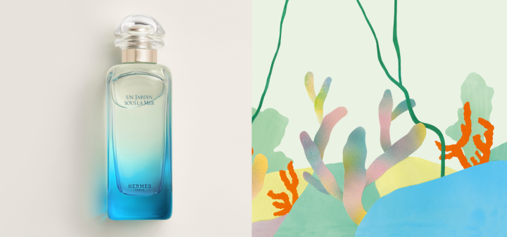 Plus blanc vaporeux que bleu mer du sud, Un jardin sous la mer n’est pas le plus facile d’accès, mais il témoigne cependant d’un parti pris audacieux de la part d’Hermès et d’une maîtrise technique remarquable de Christine Nagel.